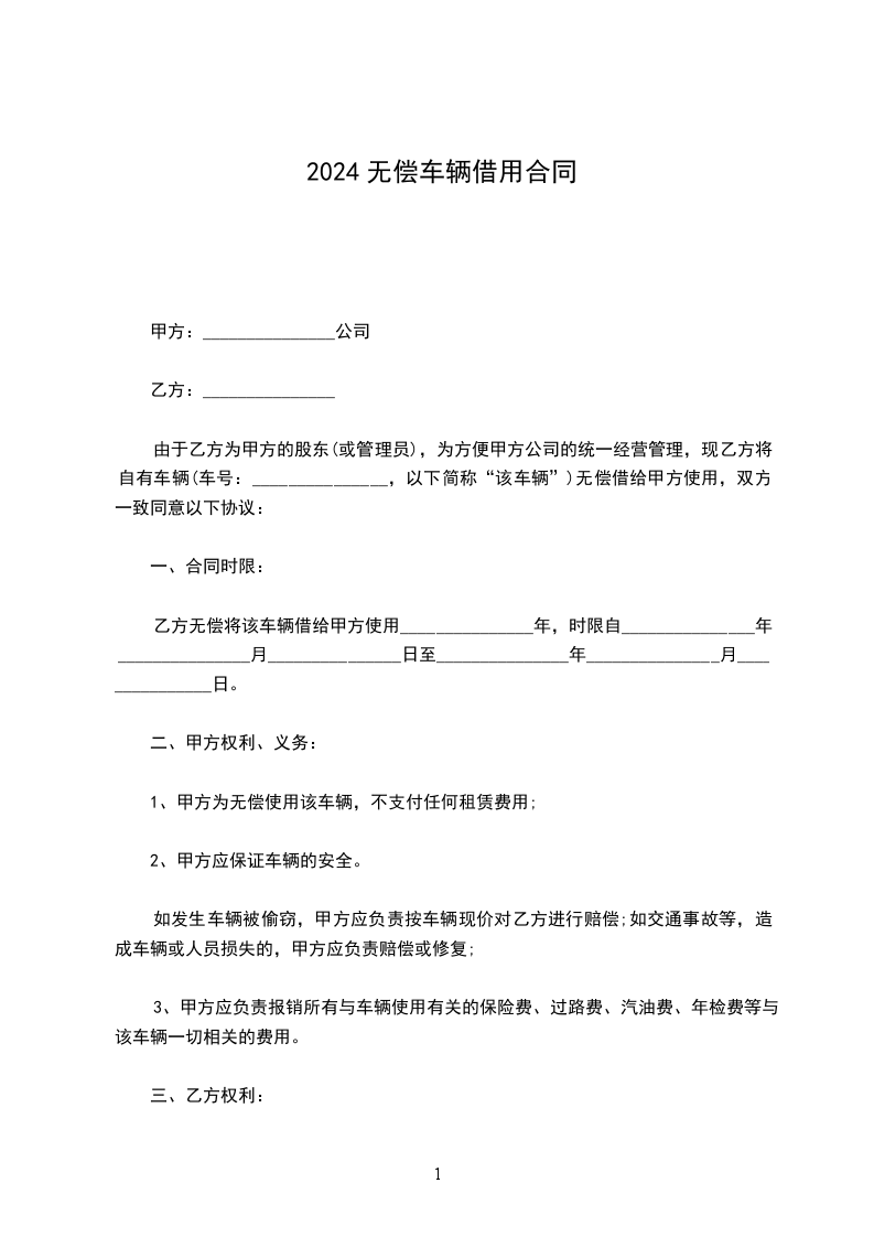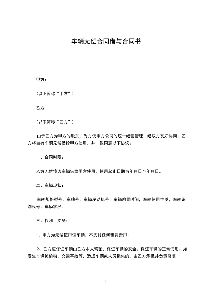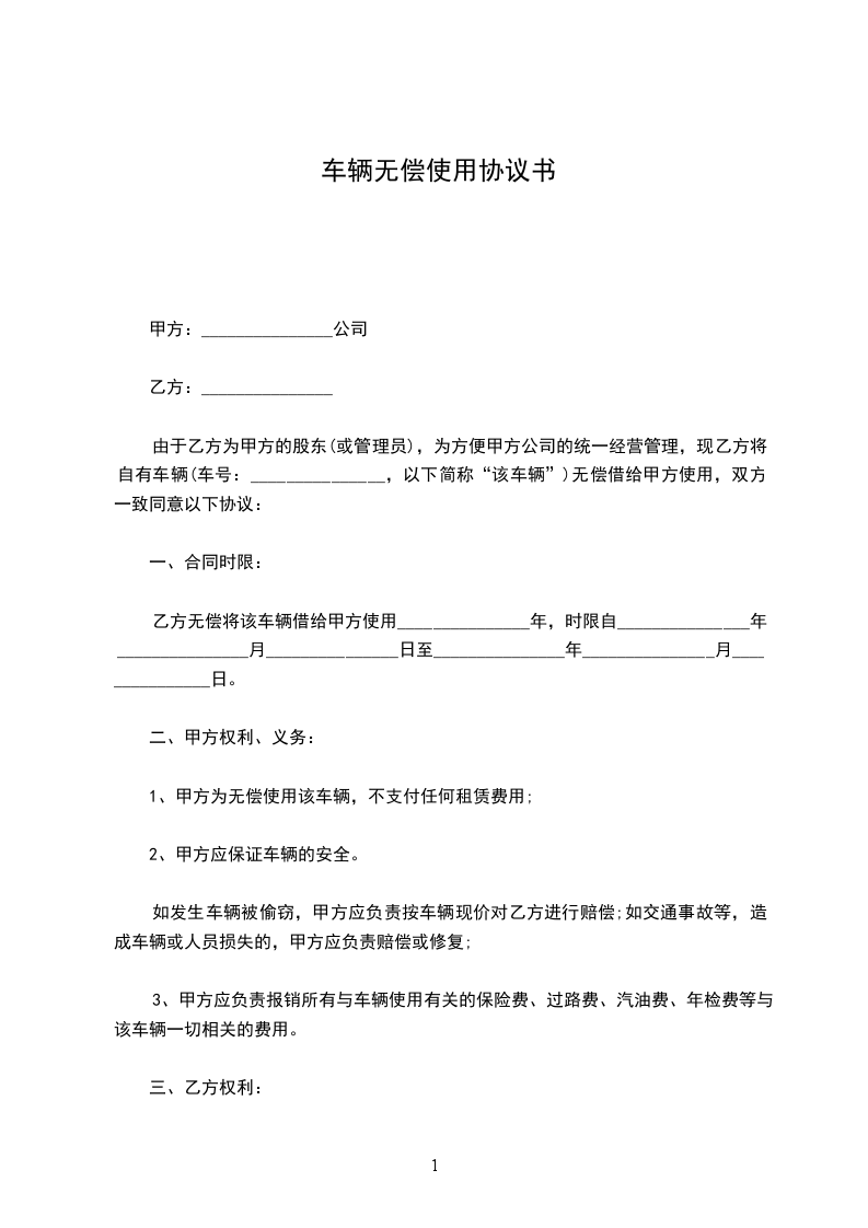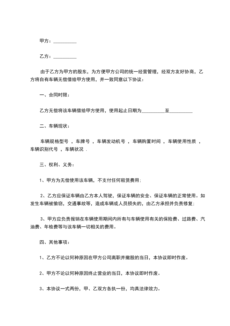 由于乙方为甲方的股东,为方便甲方公司的统一经营管理,经双方友好协商,乙方将自有车辆无偿借给甲方使用,并一致同意以下协议: