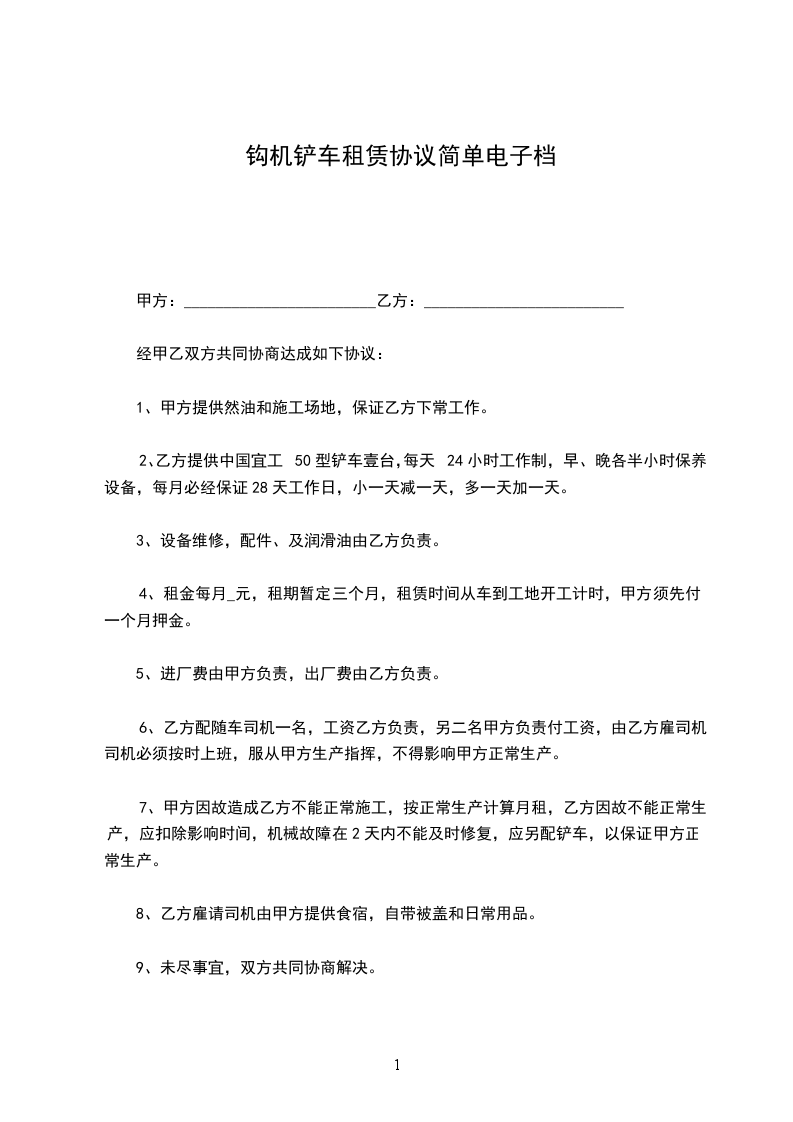 1. 甲方将型号为______的铲车(以下简称“租赁设备”)出租给乙方使用。