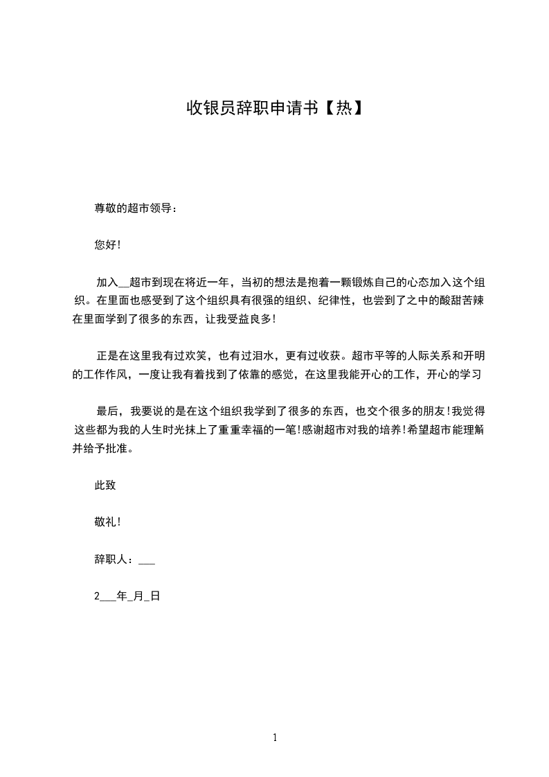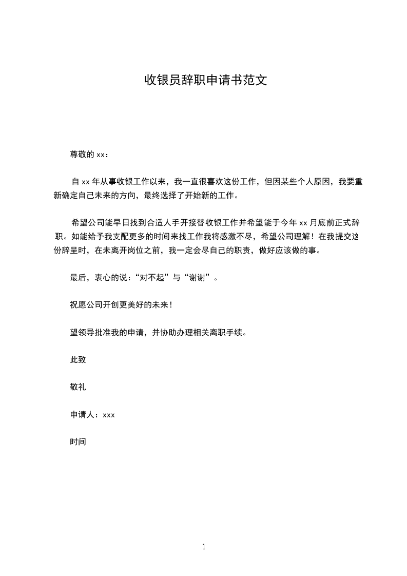 希望公司能早日找到合适人手开接替收银工作并希望能于今年xx月底前正式辞职。如能给予我支配更多的时间来找工作我将感激不尽,希望公司理解!在我提交这份辞呈时,在未离开岗位之前,我一定会尽自己的职责,做好应该做的事。