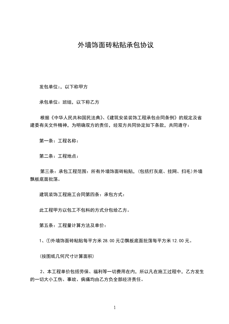 第三条:承包工程范围:所有外墙饰面砖粘贴,(包括打灰底、挂网、扫毛)外墙飘板底面批荡。