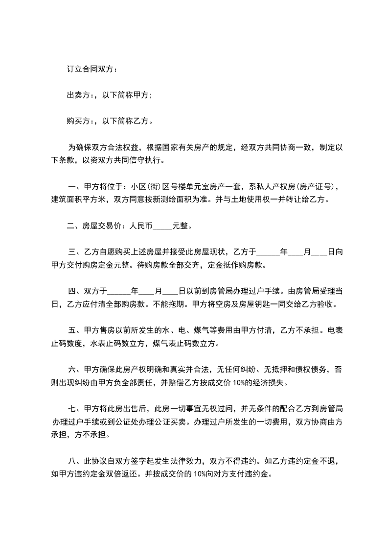 八、此协议自双方签字起发生法律效力,双方不得违约。如乙方违约定金不退,如甲方违约定金双倍返还。并按成交价的10%向对方支付违约金。