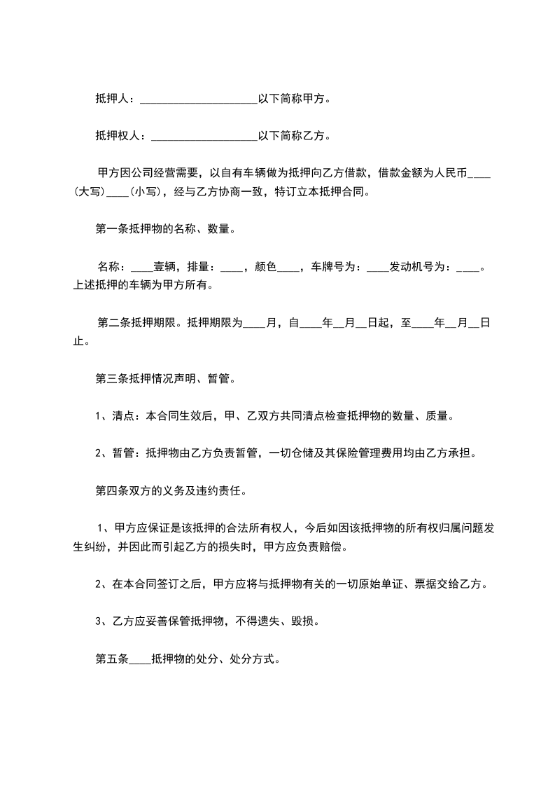 甲方因公司经营需要,以自有车辆做为抵押向乙方借款,借款金额为人民币____(大写)____(小写),经与乙方协商一致,特订立本抵押合同。