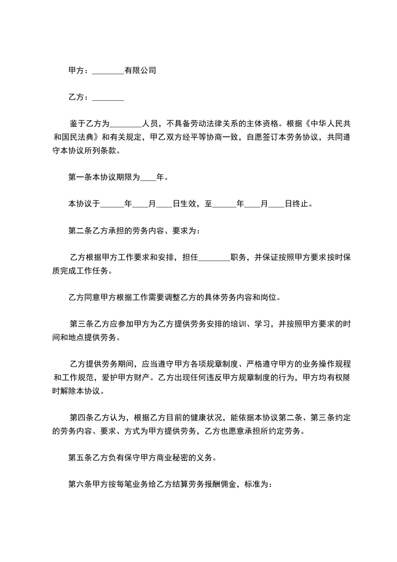 鉴于乙方为________人员,不具备劳动法律关系的主体资格。根据《中华人民共和国民法典》和有关规定,甲乙双方经平等协商一致,自愿签订本劳务协议,共同遵守本协议所列条款。