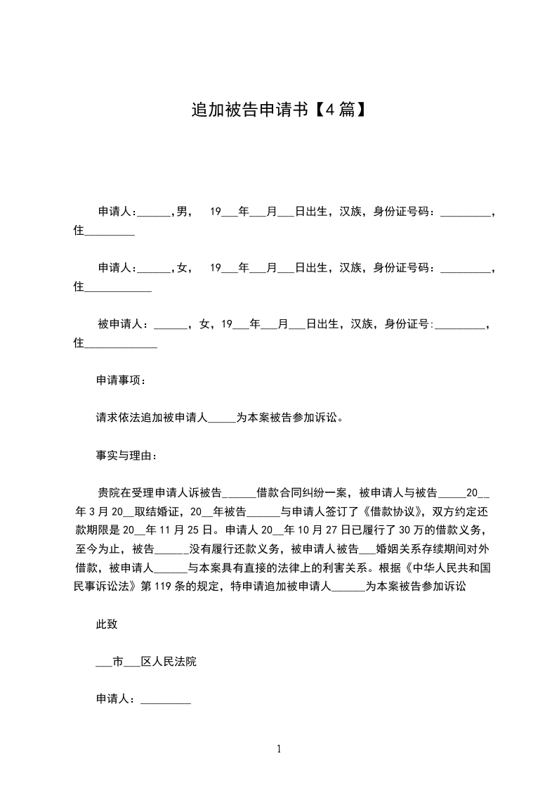 篇4《追加被告申请书》