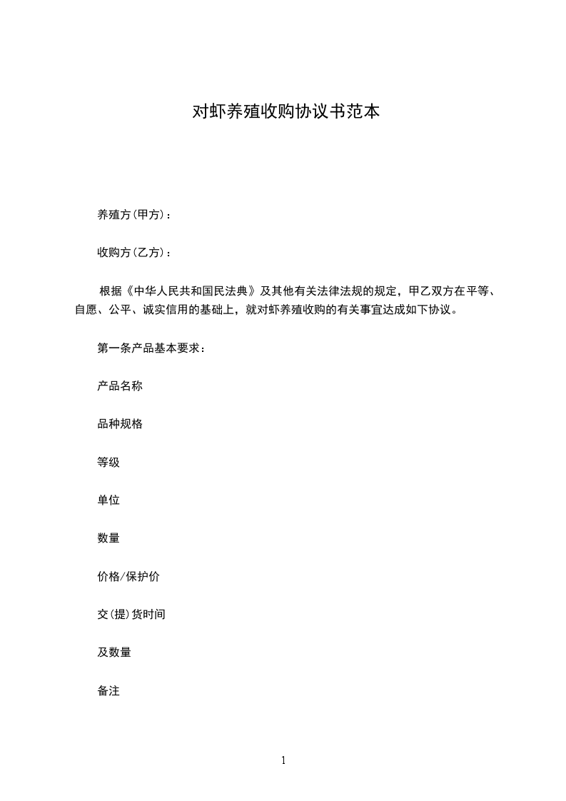 根据《中华人民共和国民法典》及其他有关法律法规的规定,甲乙双方在平等、自愿、公平、诚实信用的基础上,就对虾养殖收购的有关事宜达成如下协议。