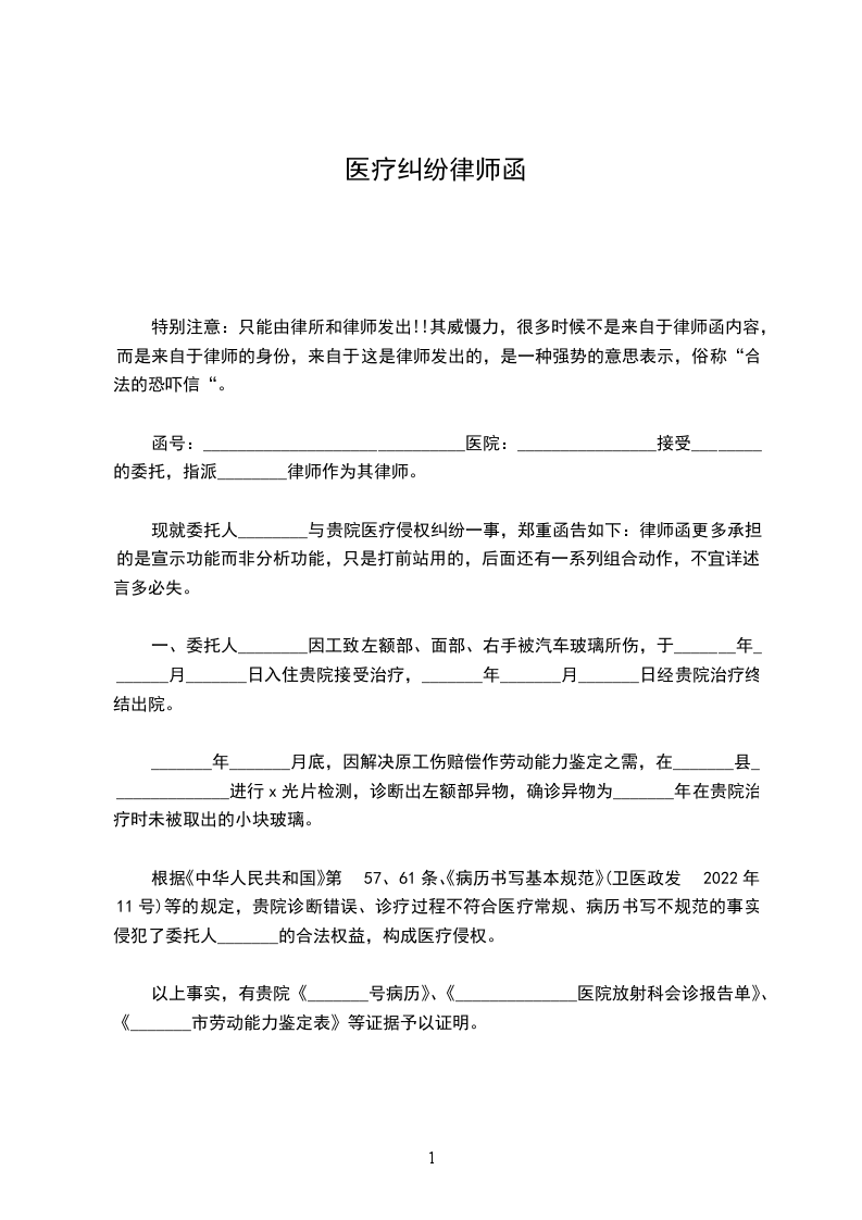 现就委托人________与贵院医疗侵权纠纷一事,郑重函告如下:律师函更多承担的是宣示功能而非分析功能,只是打前站用的,后面还有一系列组合动作,不宜详述,言多必失。
