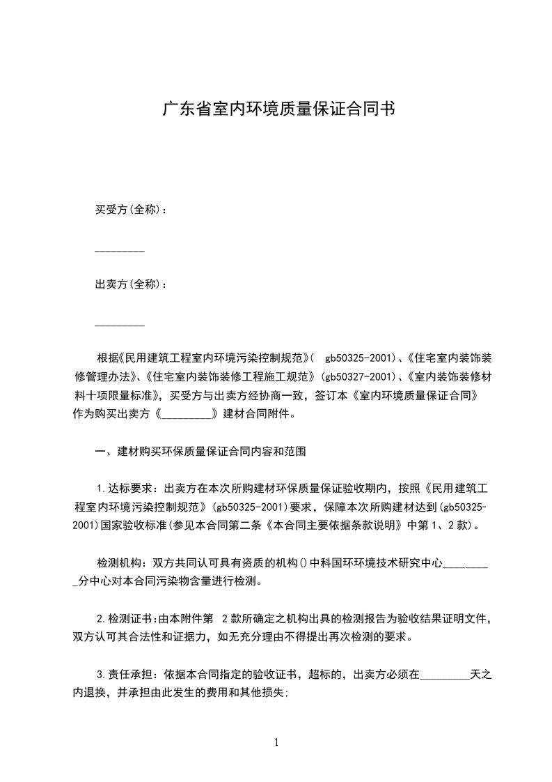 根据《民用建筑工程室内环境污染控制规范》(gb50325-2001)、《住宅室内装饰装修管理办法》、《住宅室内装饰装修工程施工规范》(gb50327-2001)、《室内装饰装修材料十项限量标准》,买受方与出卖方经协商一致,签订本《室内环境质量保证合同》作为购买出卖方《_________》建材合同附件。