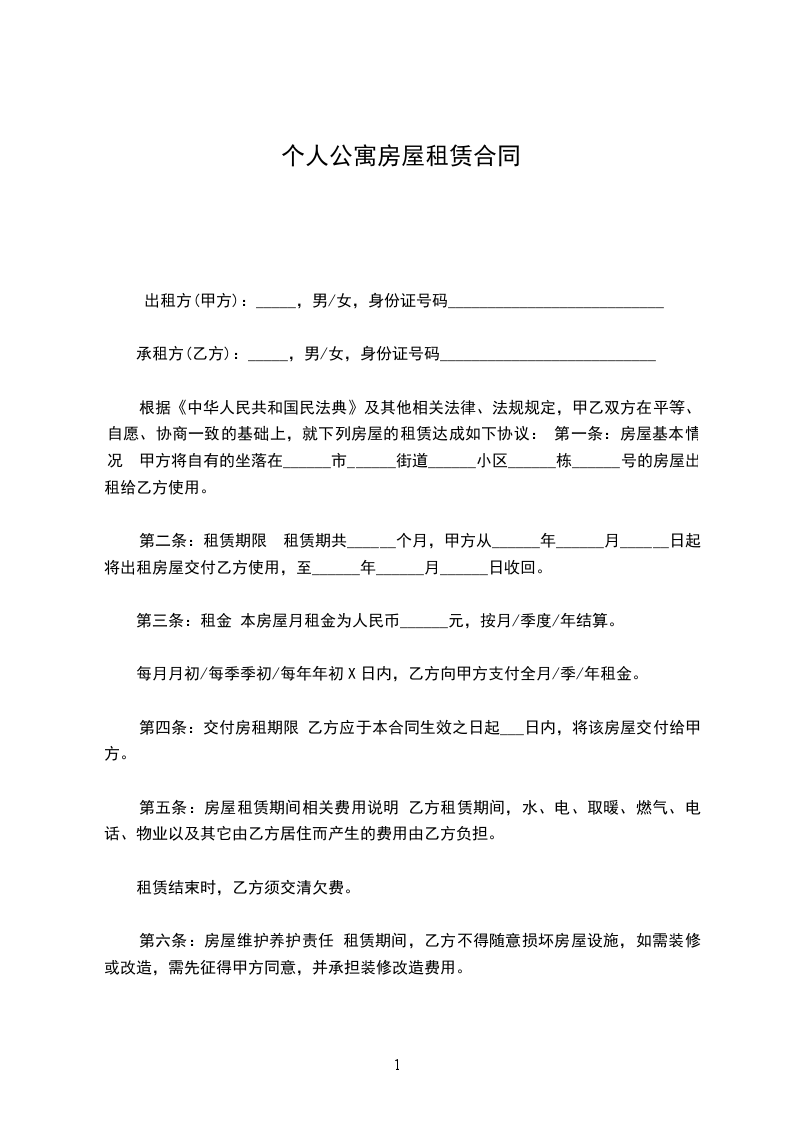 承租方(乙方):_____,男/女,身份证号码___________________________