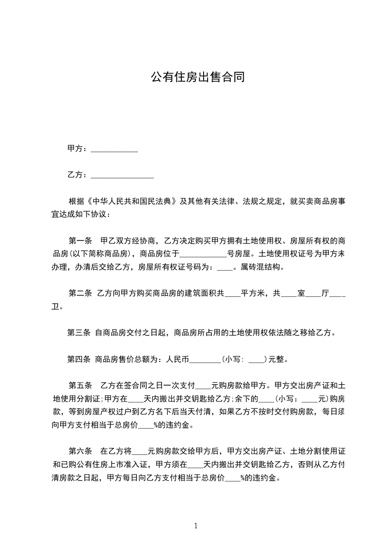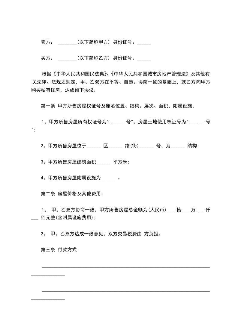 1、根据《中华人民共和国民法典》、《中华人民共和国城市房地产管理法》及其他有关法律、法规之规定,甲、乙双方在平等、自愿、协商一致的基础上,就乙方向甲方购买私有房屋,达成如下协议: