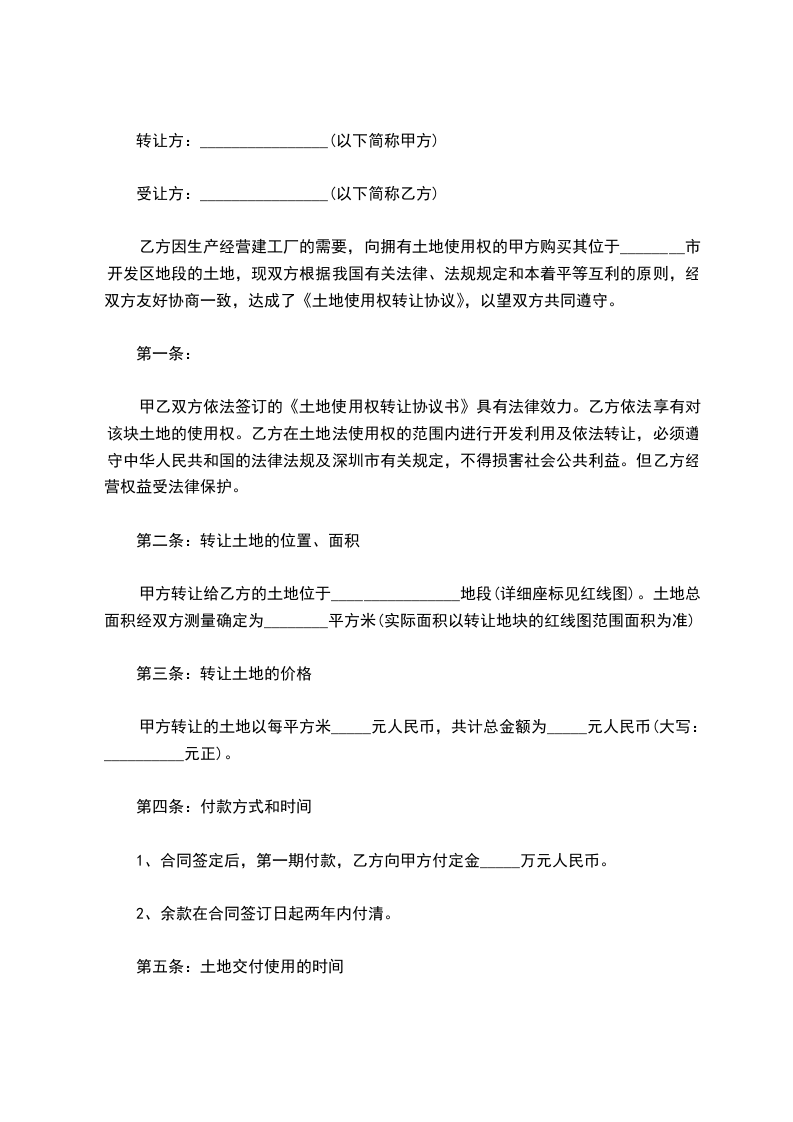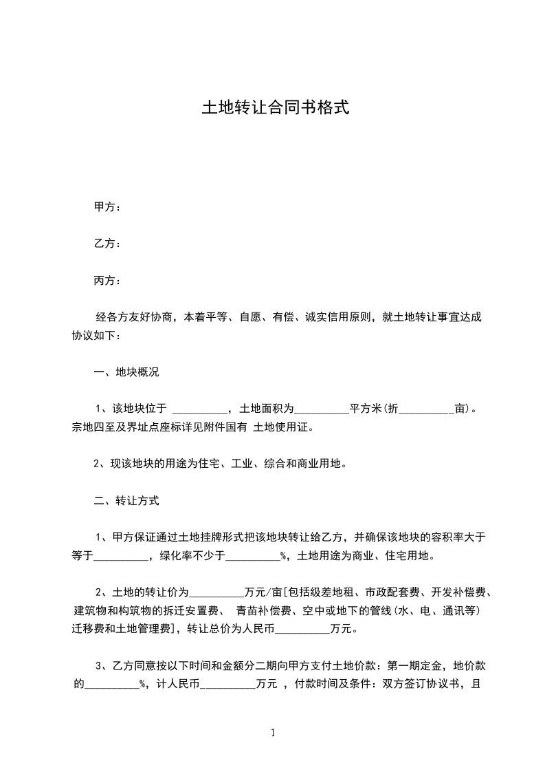 1、甲方保证通过土地挂牌形式把该地块转让给乙方,并确保该地块的容积率大于等于__________,绿化率不少于__________%,土地用途为商业、住宅用地。