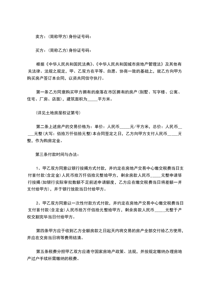 第一条乙方同意购买甲方拥有的座落在市区拥有的房产(别墅、写字楼、公寓、住宅、厂房、店面),建筑面积为_____平方米。