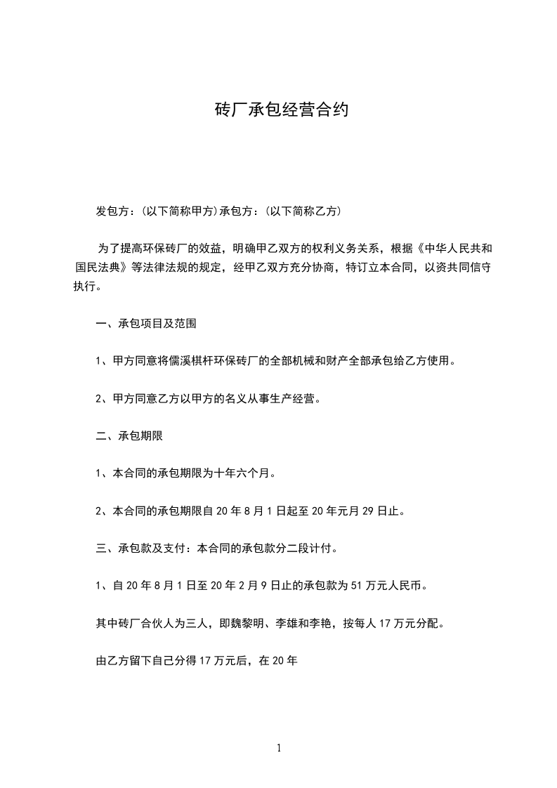 为了提高环保砖厂的效益,明确甲乙双方的权利义务关系,根据《中华人民共和国民法典》等法律法规的规定,经甲乙双方充分协商,特订立本合同,以资共同信守执行。