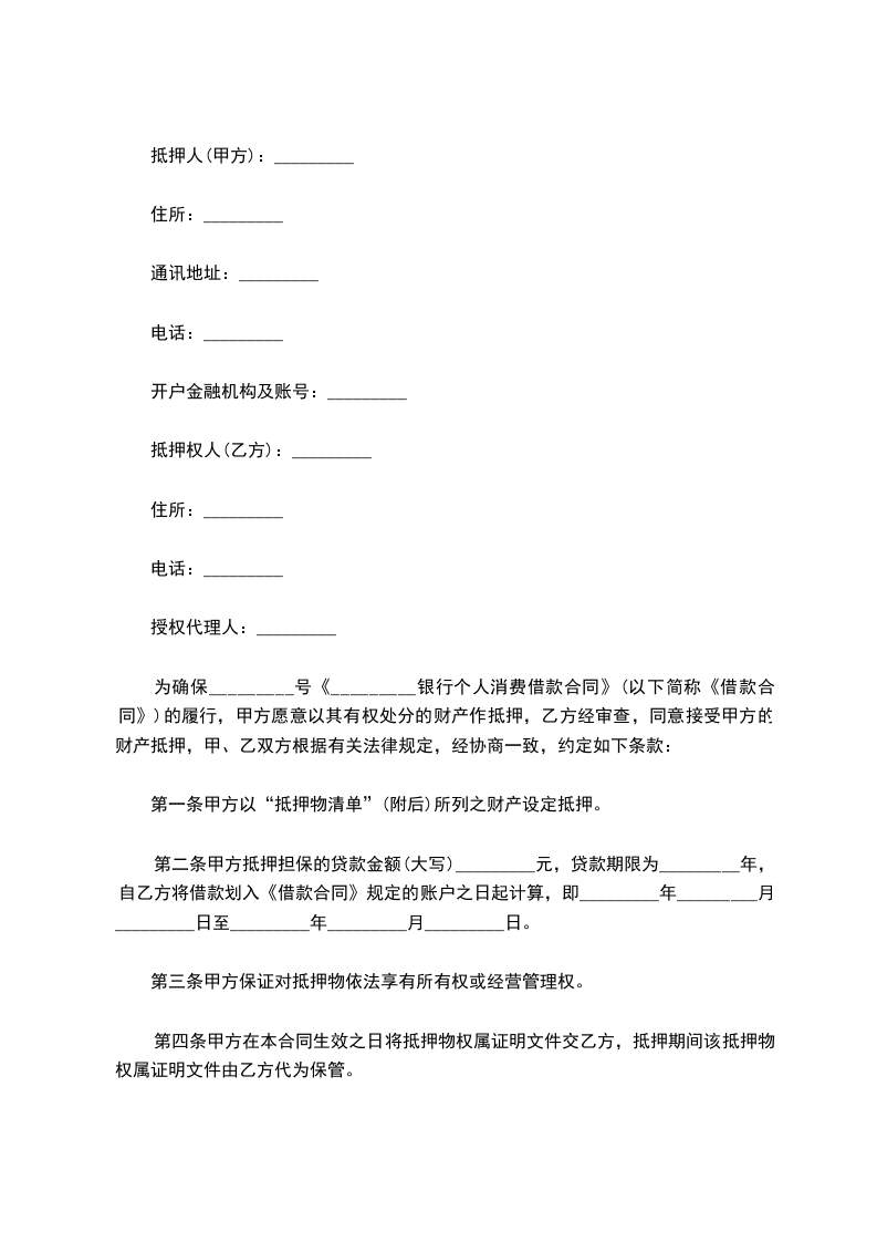 为确保_________号《_________银行个人消费借款合同》(以下简称《借款合同》)的履行,甲方愿意以其有权处分的财产作抵押,乙方经审查,同意接受甲方的财产抵押,甲、乙双方根据有关法律规定,经协商一致,约定如下条款: