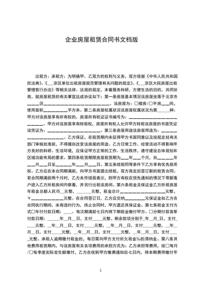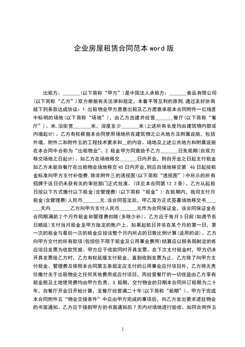 篇1 企业房屋租赁合同