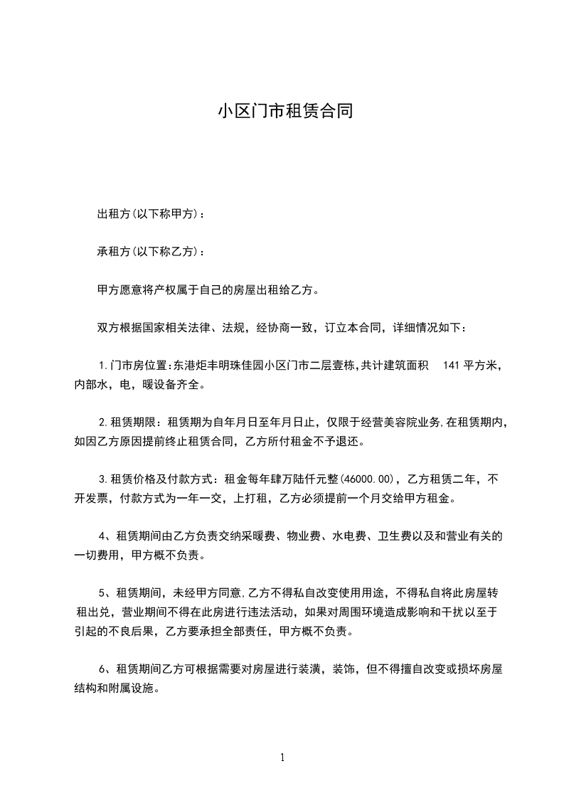 2.租赁期限:租赁期为自_____年_____月_____日至_____年_____月_____日止,仅限于经营美容院业务,在租赁期内,如因乙方原因提前终止租赁合同,乙方所付租金不予退还。