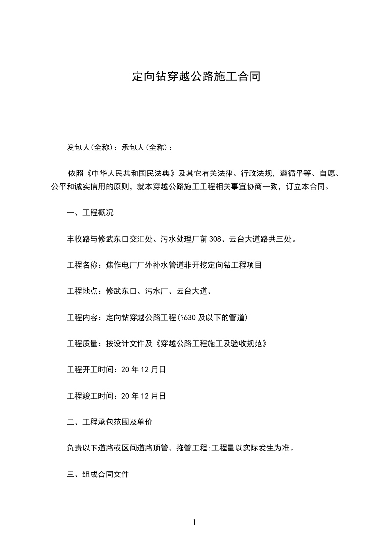 依照《中华人民共和国民法典》及其它有关法律、行政法规,遵循平等、自愿、公平和诚实信用的原则,就本穿越公路施工工程相关事宜协商一致,订立本合同。