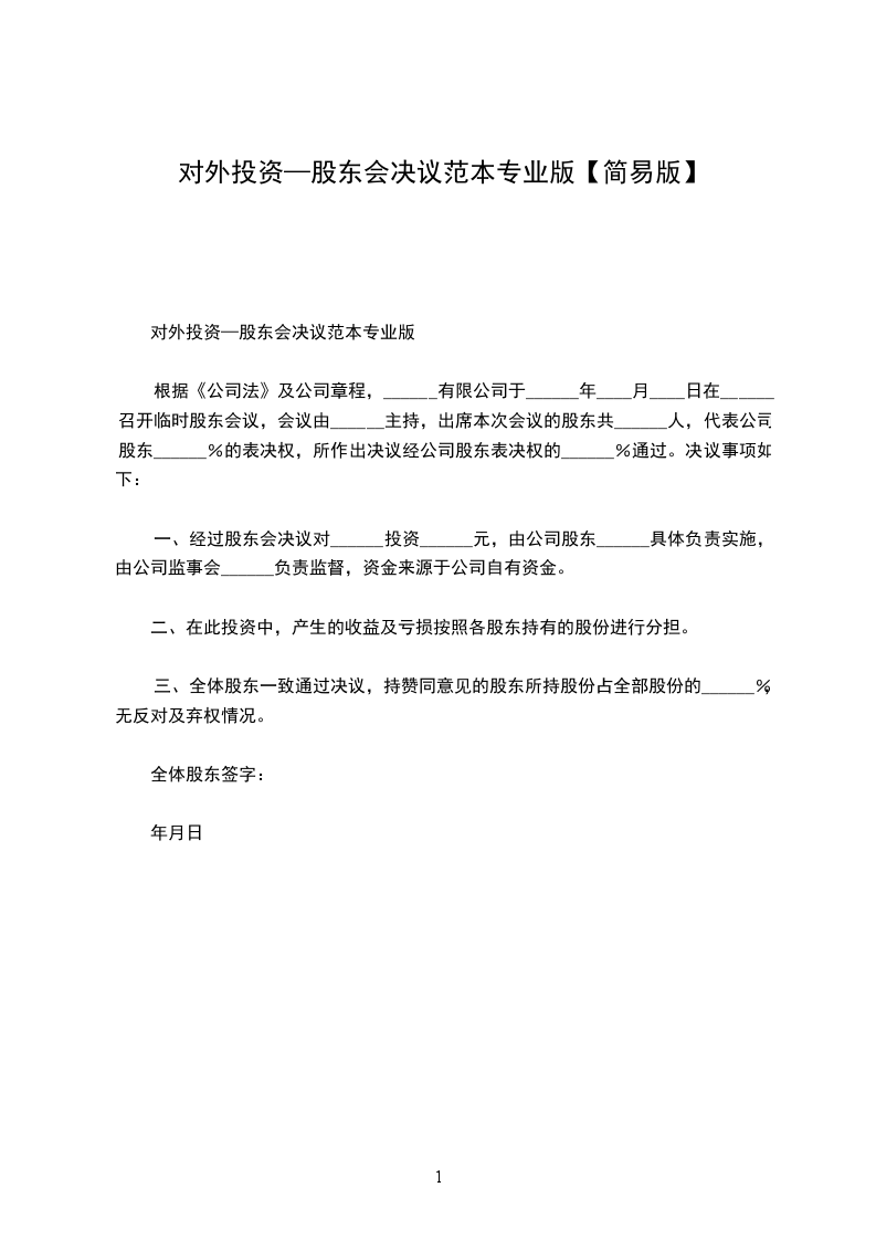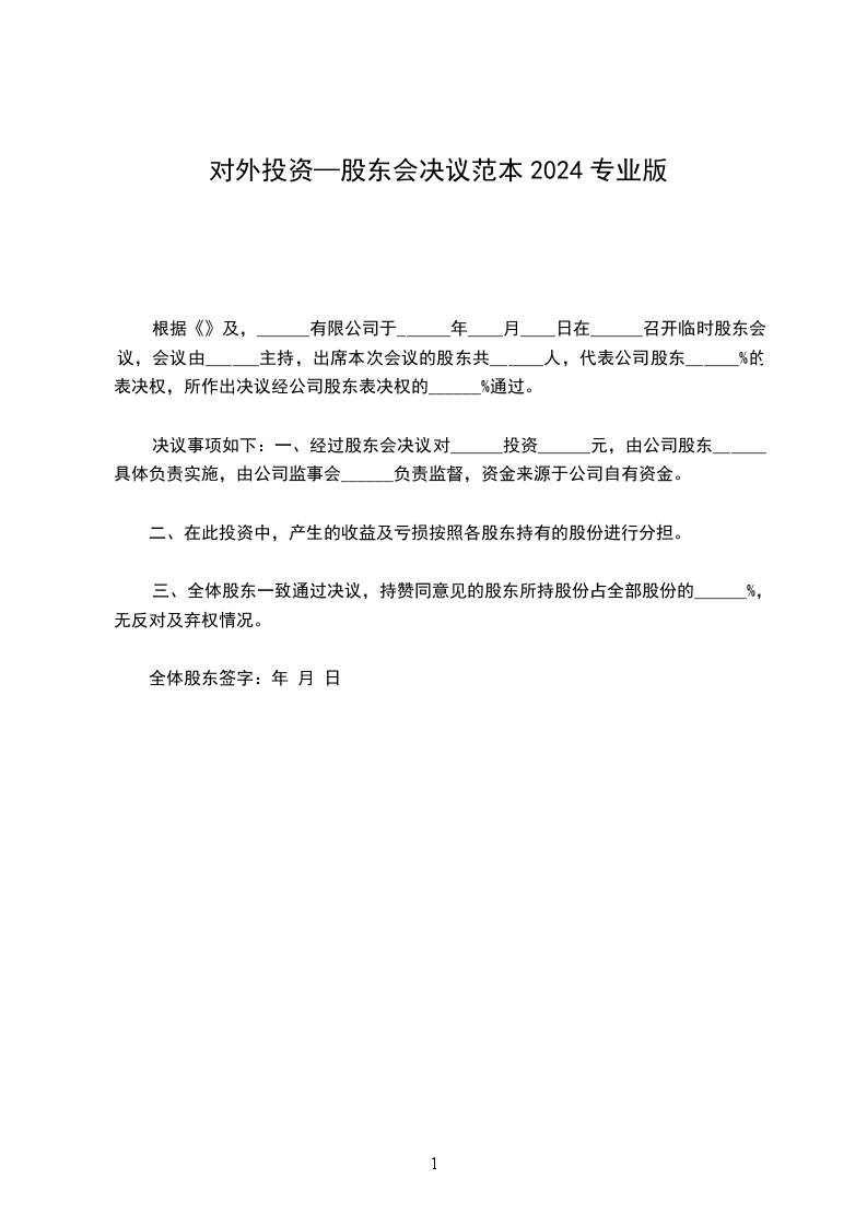 决议事项如下:一、经过股东会决议对______投资______元,由公司股东______具体负责实施,由公司监事会______负责监督,资金来源于公司自有资金。