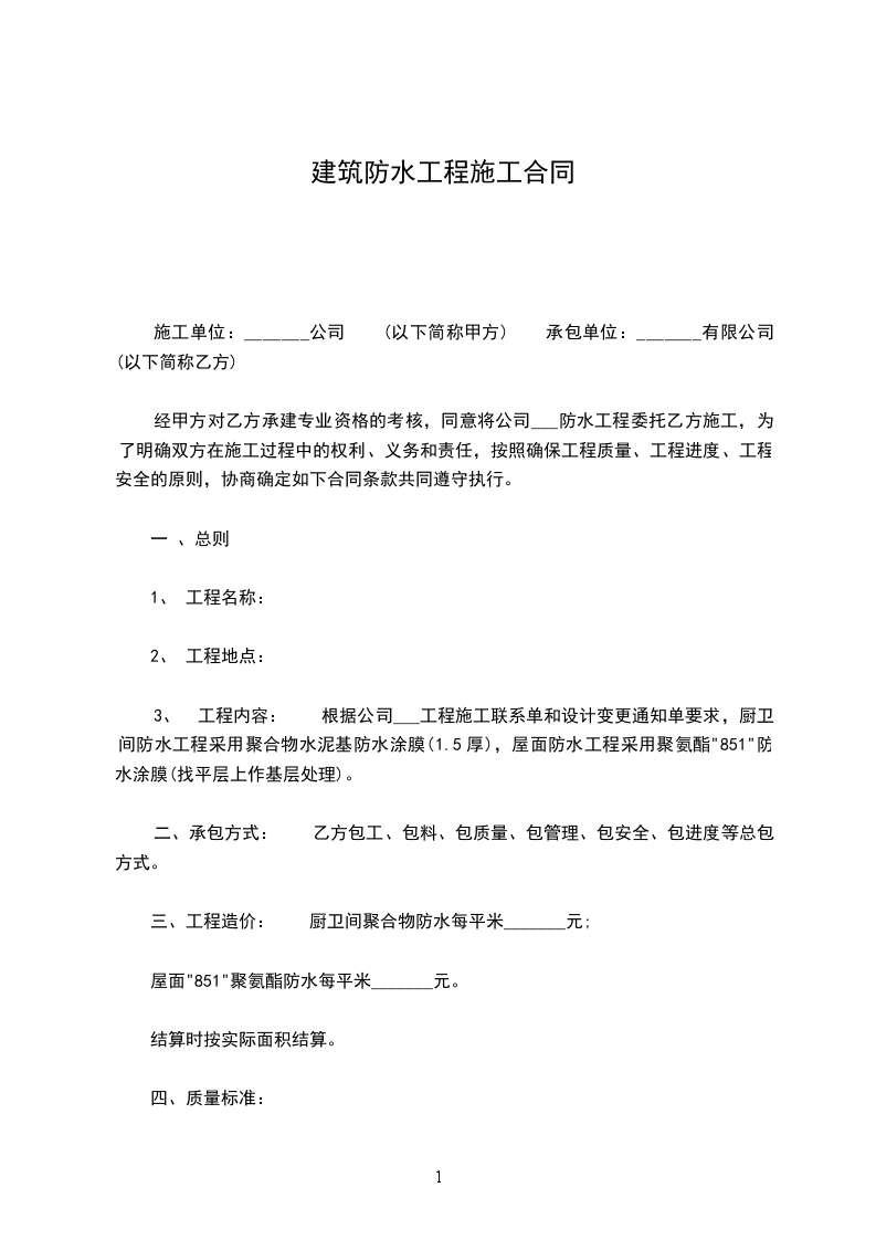 三、工程造价: 厨卫间聚合物防水每平米_______元;