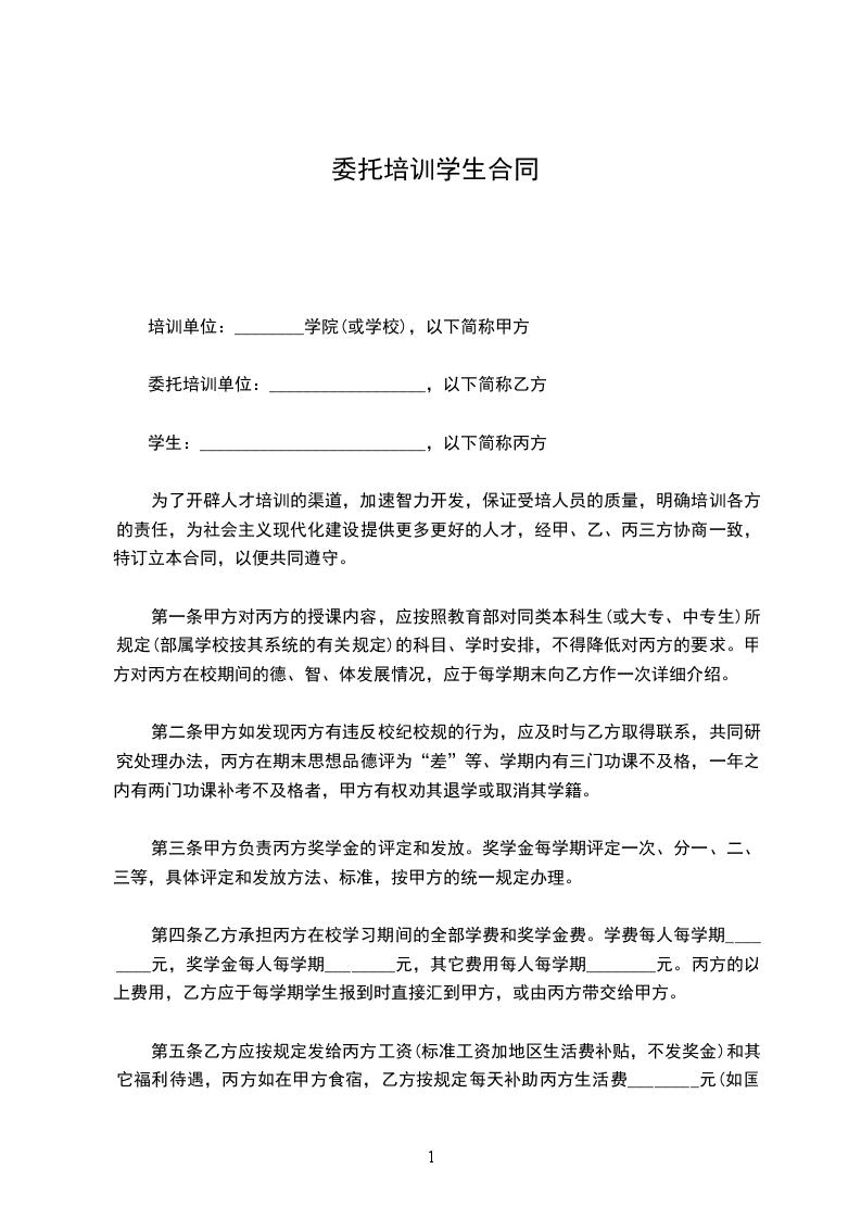 培训单位:____学院(或学校),以下得称甲方:委托培训单位:____,以下简称丙方。