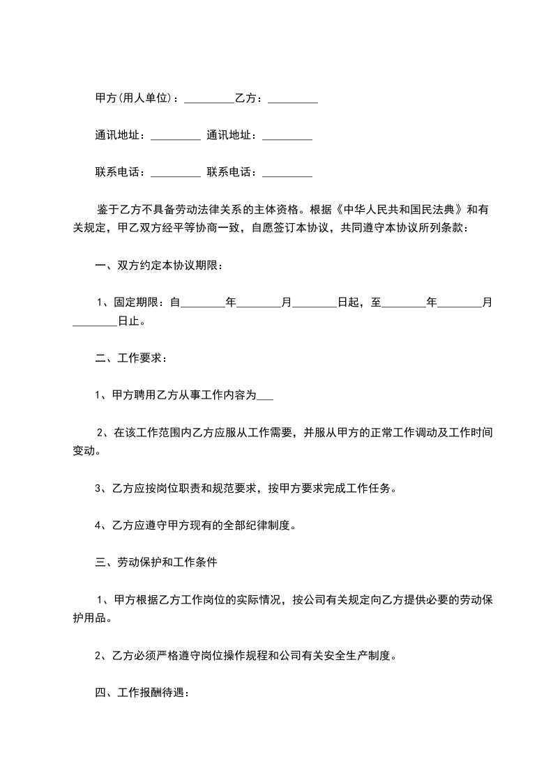 乙方(退休人员)姓名:联系电话:住所地:居民身份证号码:法定代表人(负责人):联系电话:住址(通讯地址):