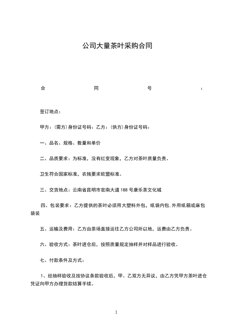 1、经抽样验收及按协议条款验收后,甲、乙双方无异议,由乙方凭甲方茶叶进仓凭证向甲方办理货款结算手续。