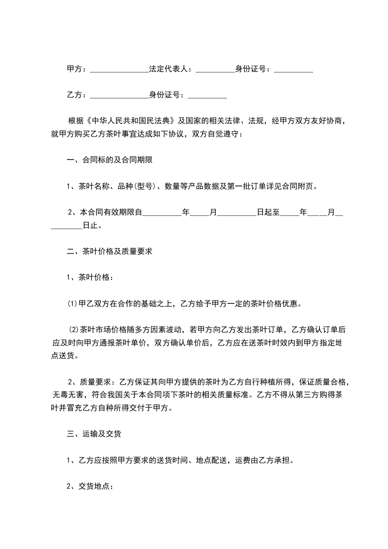 五、运输及费用:乙方由茶场直接运往乙方公司所以地,运费由乙方负责。