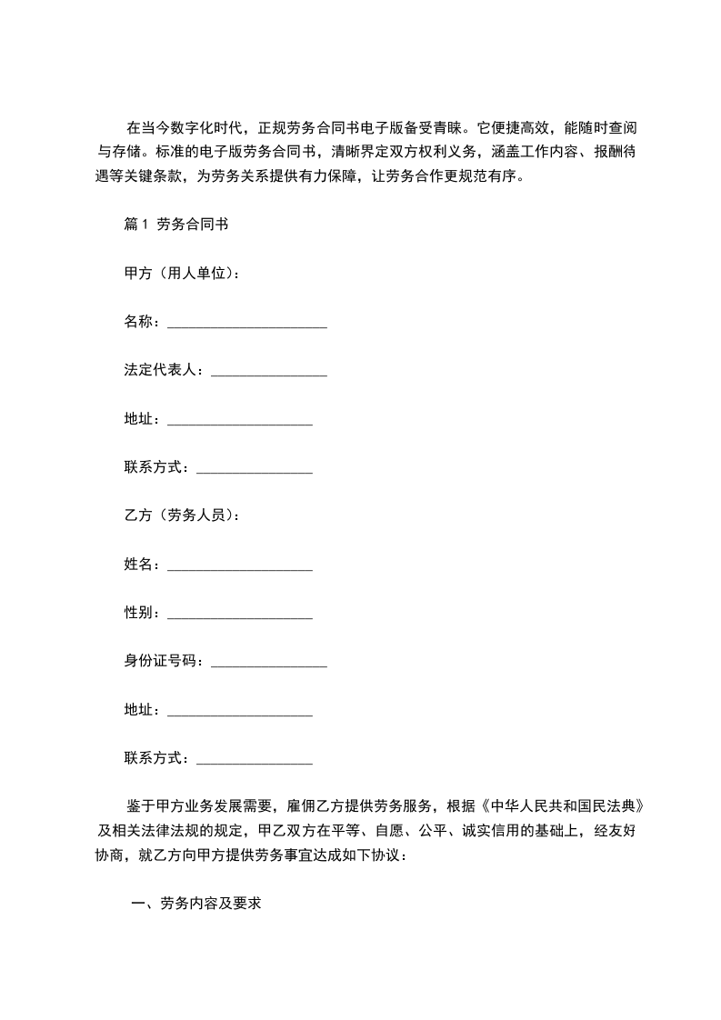 1. 劳务内容:乙方根据甲方要求,提供[具体劳务内容]服务。