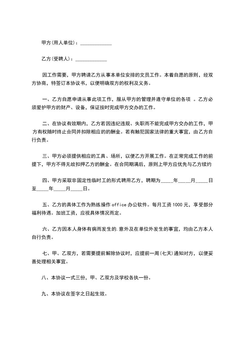 一、劳动者同意用人单位按排从事工作。