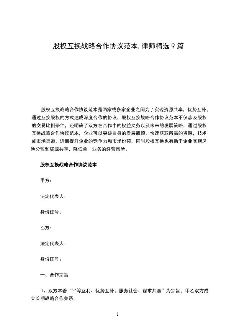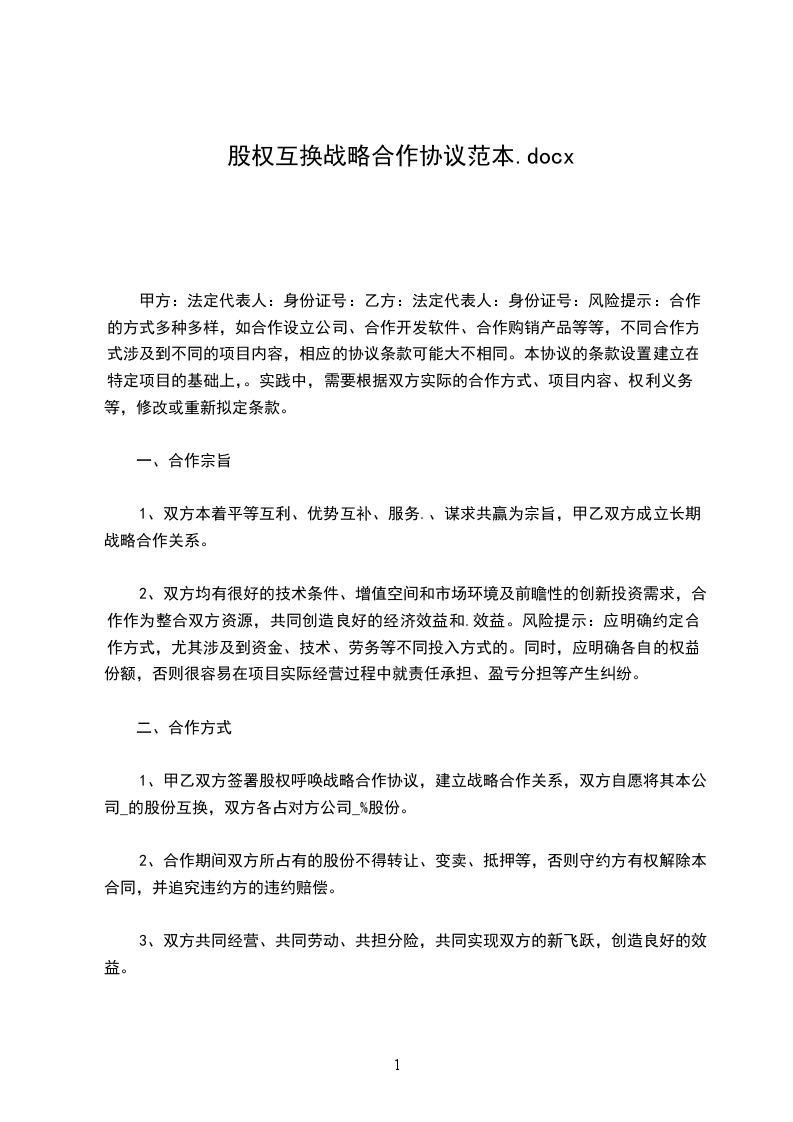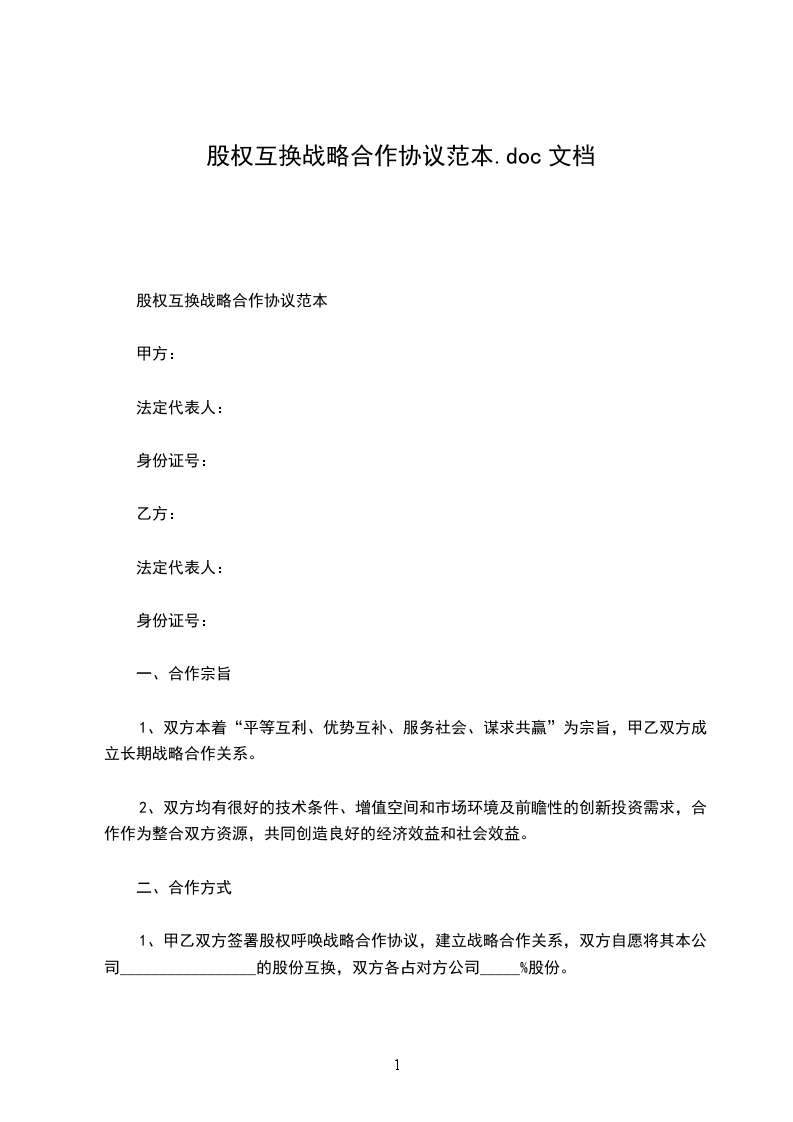 1、甲乙双方签署股权互换战略合作协议,建立战略合作关系,双方自愿将其本公司_________________的股份互换,双方各占对方公司_____%股份。