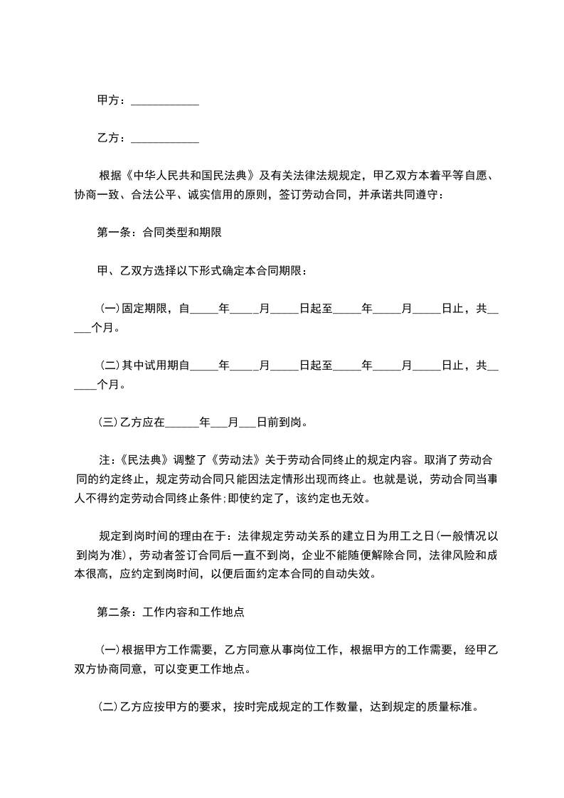 根据《中华人民共和国民法典》及有关法律法规规定,甲乙双方本着平等自愿、协商一致、合法公平、诚实信用的原则,签订劳动合同,并承诺共同遵守:
