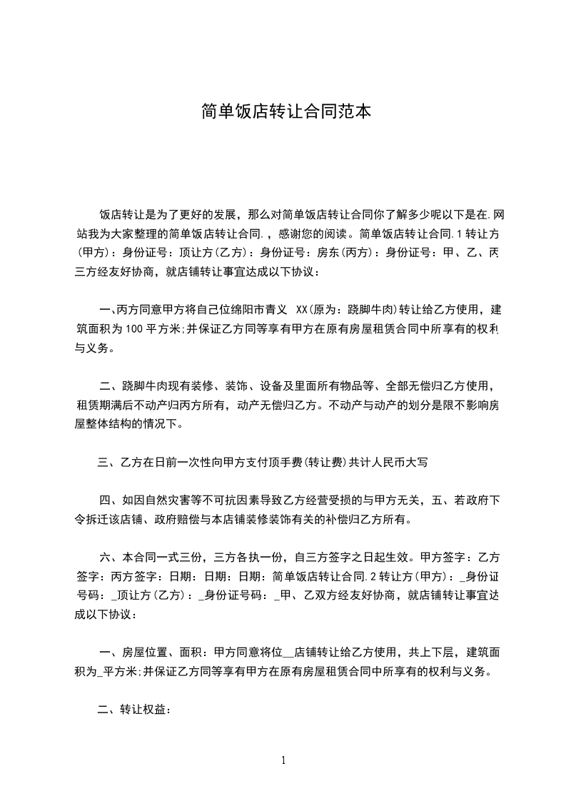 篇1 饭店转让合同