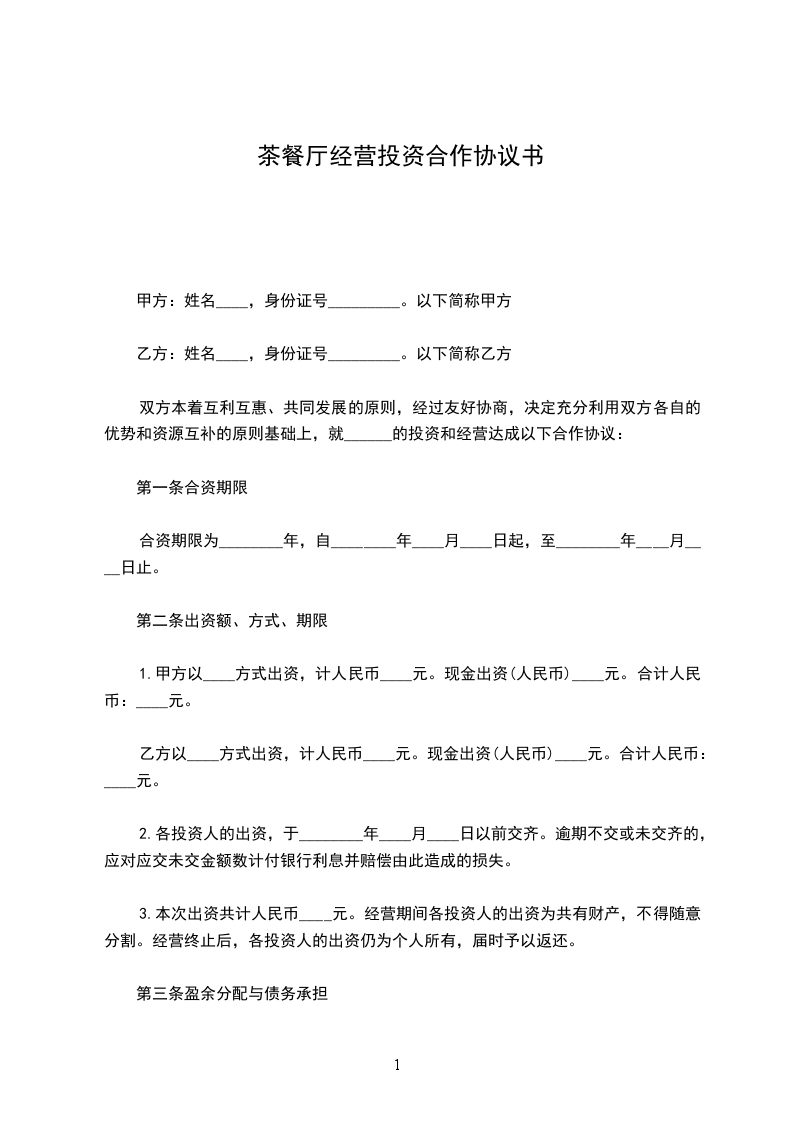 1. 甲方投资:甲方以现金方式投资人民币____元,占总投资比例的____%。该投资款应于本协议签订之日起____日内足额支付至双方共同指定的银行账户。