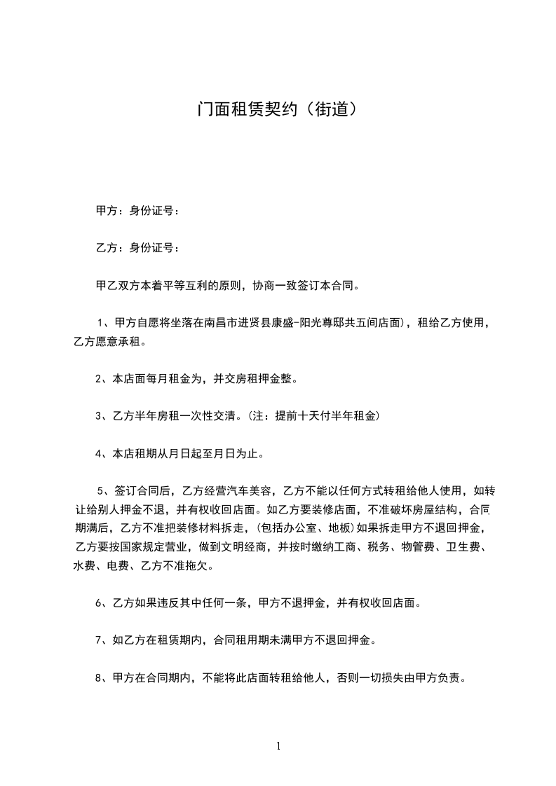 1、甲方自愿将坐落在南昌市进贤县康盛-阳光尊邸共五间店面),租给乙方使用,乙方愿意承租。