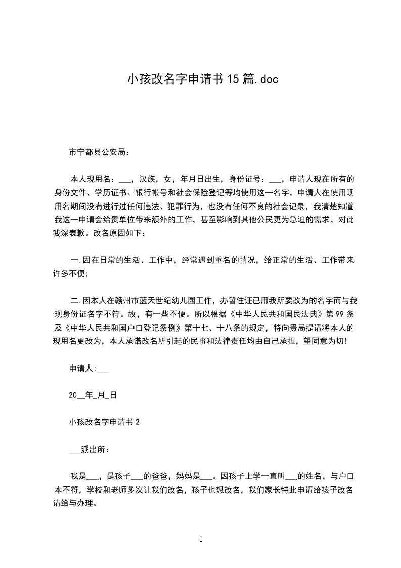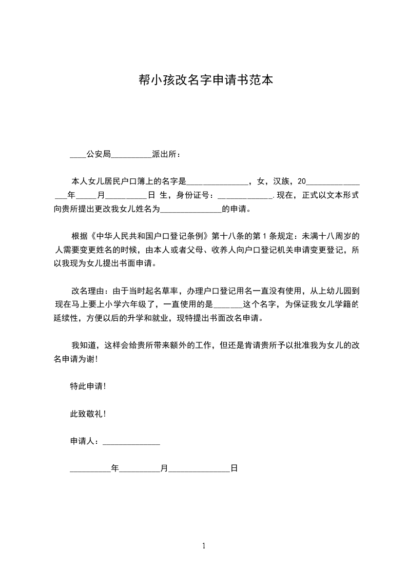 我是[小孩姓名]的[父亲/母亲],身份证号为[你的身份证号码],联系电话为[你的电话号码]。我郑重地向贵部门提交为小孩更改姓名的申请。