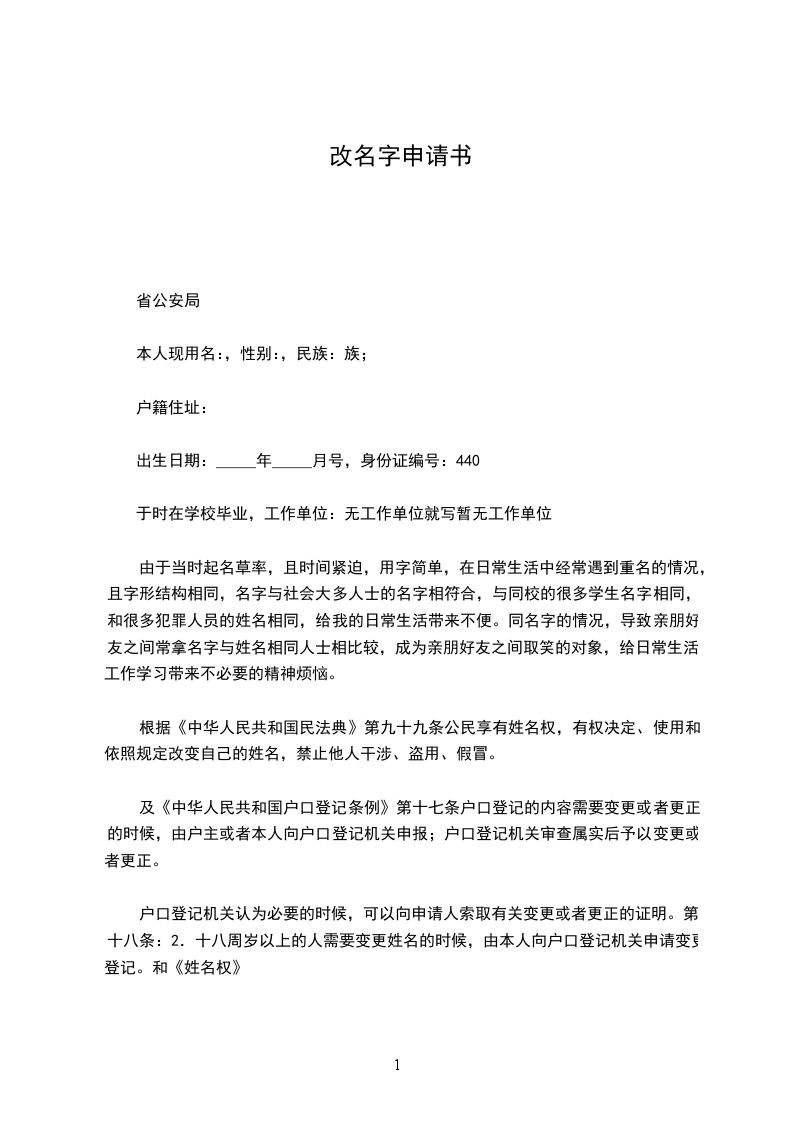 本人姓名[现姓名],性别[性别],身份证号码为[身份证号码],于[出生日期]出生,常住户口地址为[现住址]。因[具体重名原因],导致日常生活及社会活动中诸多不便,现申请将本人姓名变更为[拟变更姓名]。