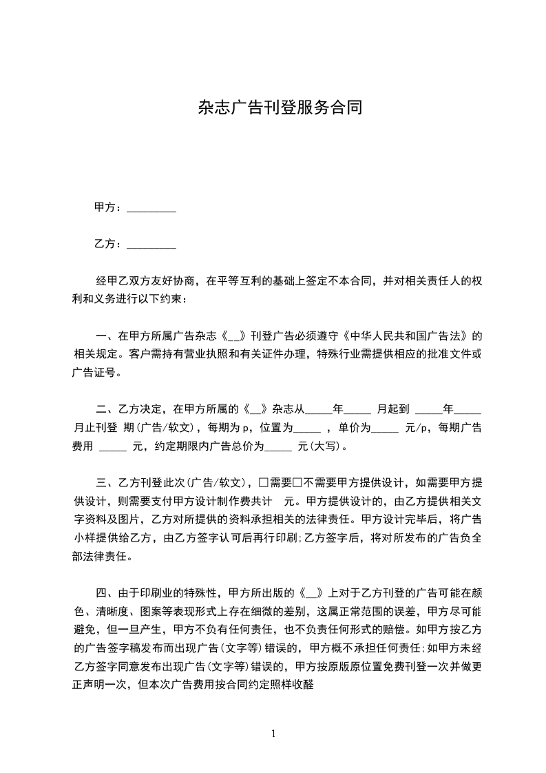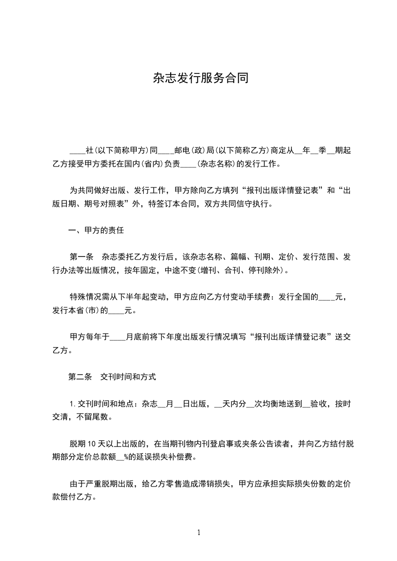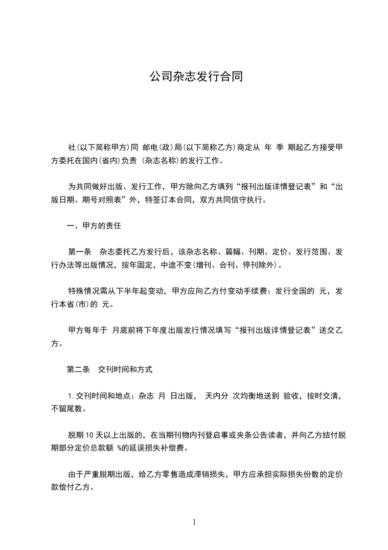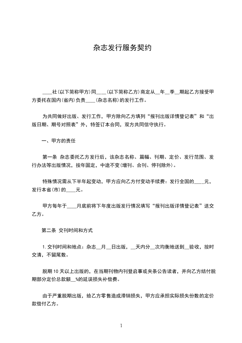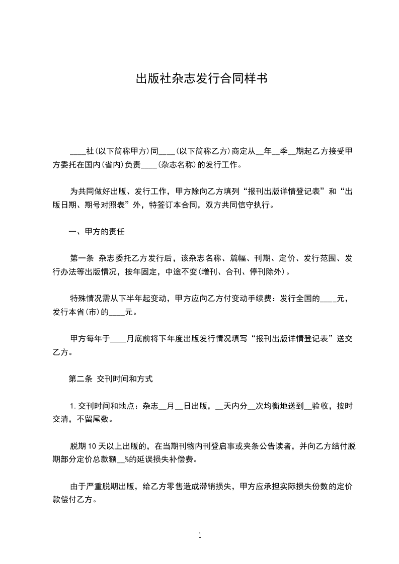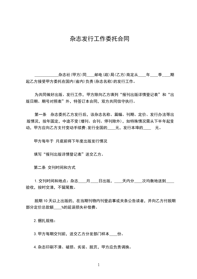 第一条 杂志委托乙方发行后,该杂志名称、篇幅、刊期、定价、发行范围、发行办法等出版情况,按年固定,中途不变(增刊、合刊、停刊除外)。