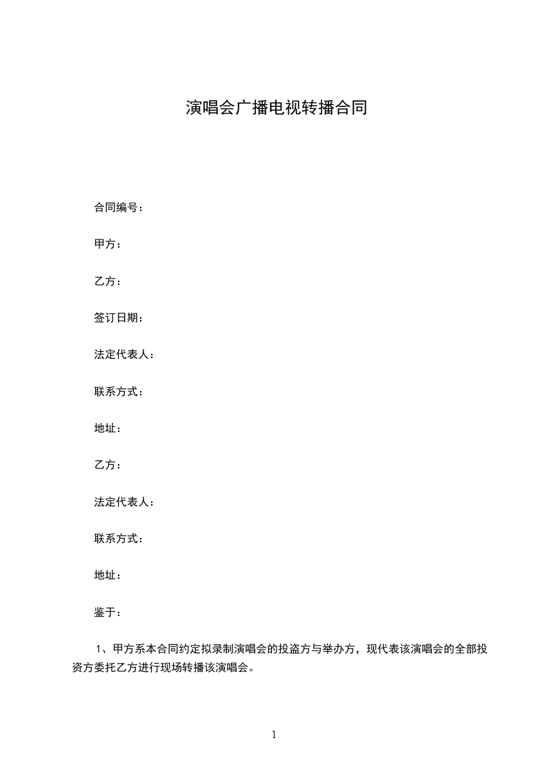 1、就甲方许可乙方进行本次演唱会广播/电视转播,乙方向甲方支付许可费元。