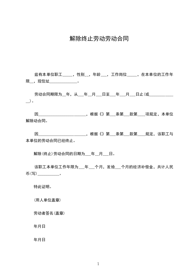 解除(终止)劳动合同的日期为___年__月___日。