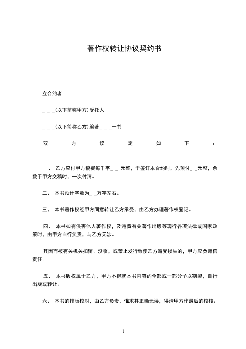 一、 乙方应付甲方稿费每千字_ _ 元整,于签订本合约时,先预付_ _元整,余数于甲方交稿时,一次付清。