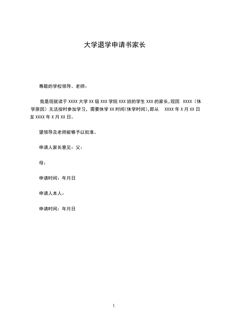 我是现就读于XXXX大学XX级XXX学院XXX班的学生XXX的家长,现因XXXX(休学原因)无法按时参加学习,需要休学XX时间(休学时间),即从XXXX年X月XX日至XXXX年X月XX日。