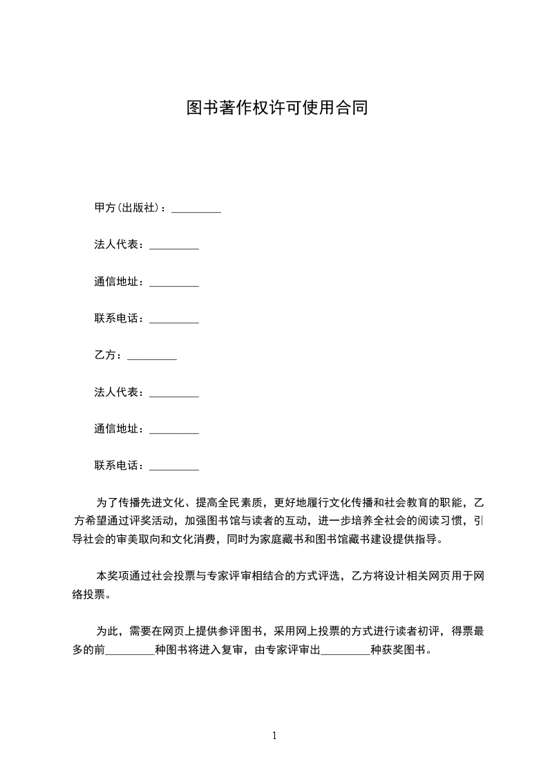 1、甲方同意向乙方无偿非专属授权使用书名为_________的著作(包括该著作的版式及装帧,以下简称本著作)