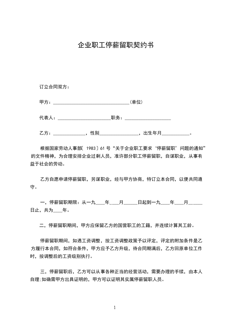 一,停薪留职期限:从一九____年____月______日起到一九____年____月______日止,共为____年。