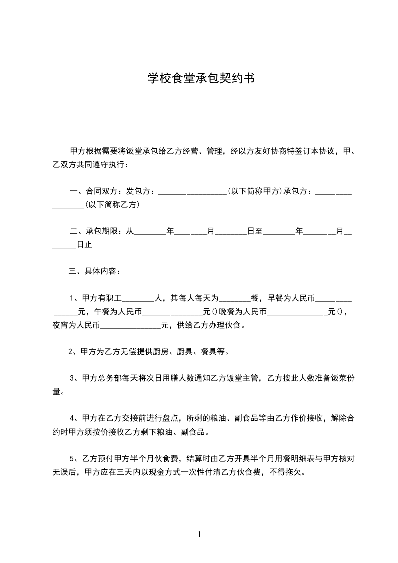 根据《中华人民共和国民法典》及相关法律规定,甲乙双方就甲方食堂承包事宜共同协商,达成如下协议: