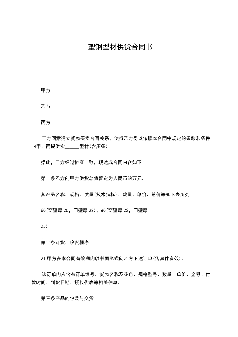 三方同意建立货物买卖合同关系,使得乙方得以依照本合同中规定的条款和条件向甲、丙提供实______型材(含压条)。