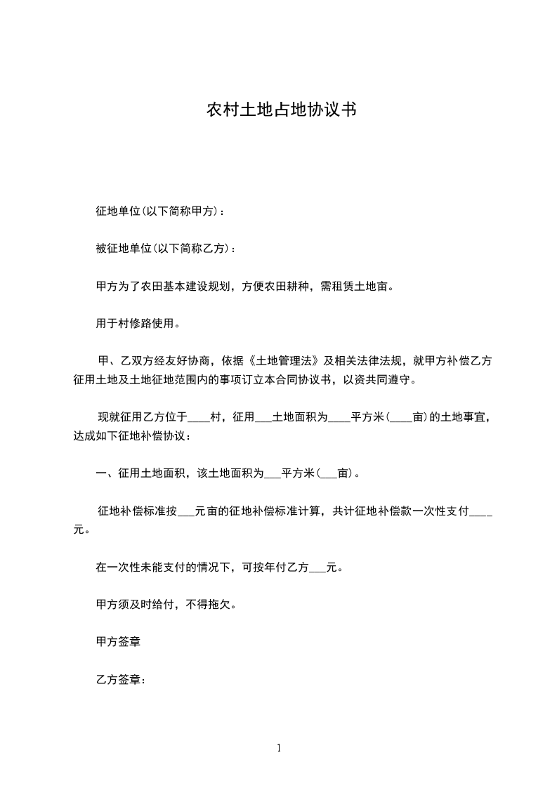 现就征用乙方位于____村,征用___土地面积为____平方米(____亩)的土地事宜,达成如下征地补偿协议:
