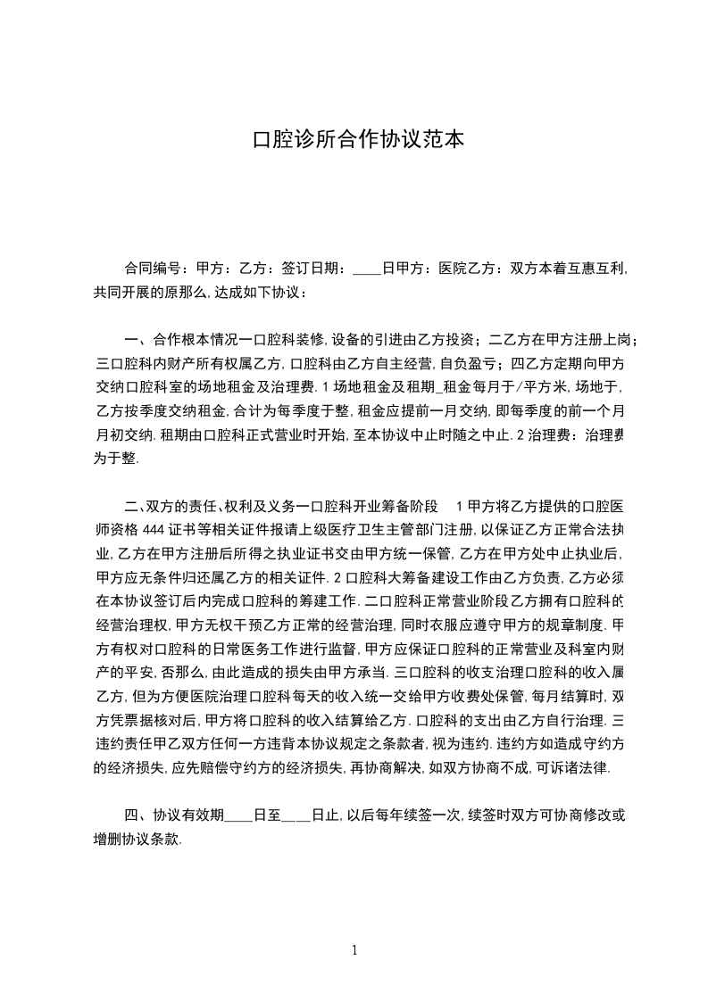 1. 双方共同投资、共同经营、共享收益、共担风险,合作开办[口腔诊所具体名称](以下简称“诊所”)。