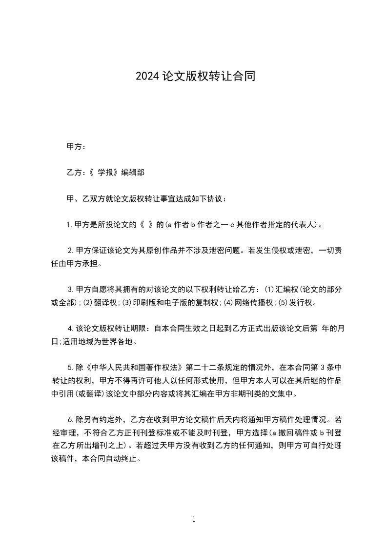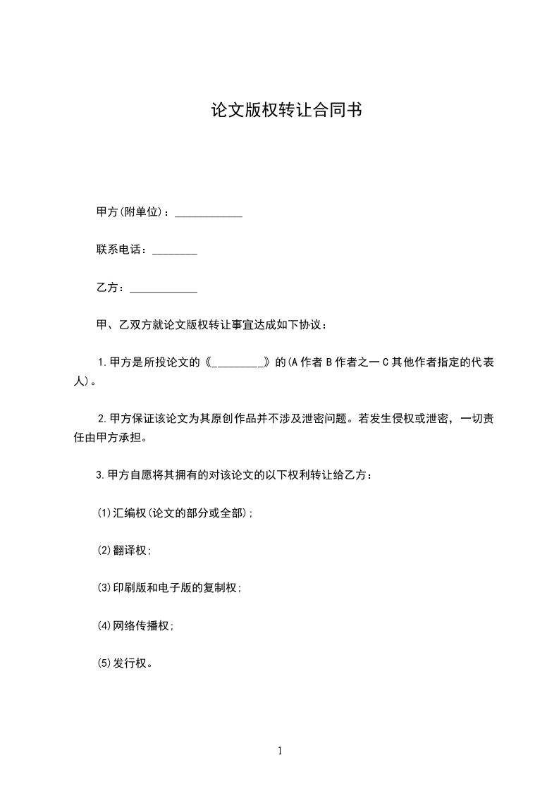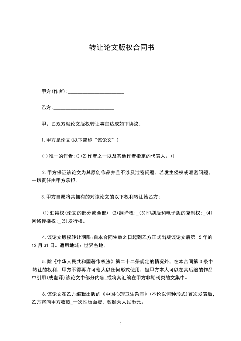 甲、乙双方就论文版权转让事宜达成如下协议: