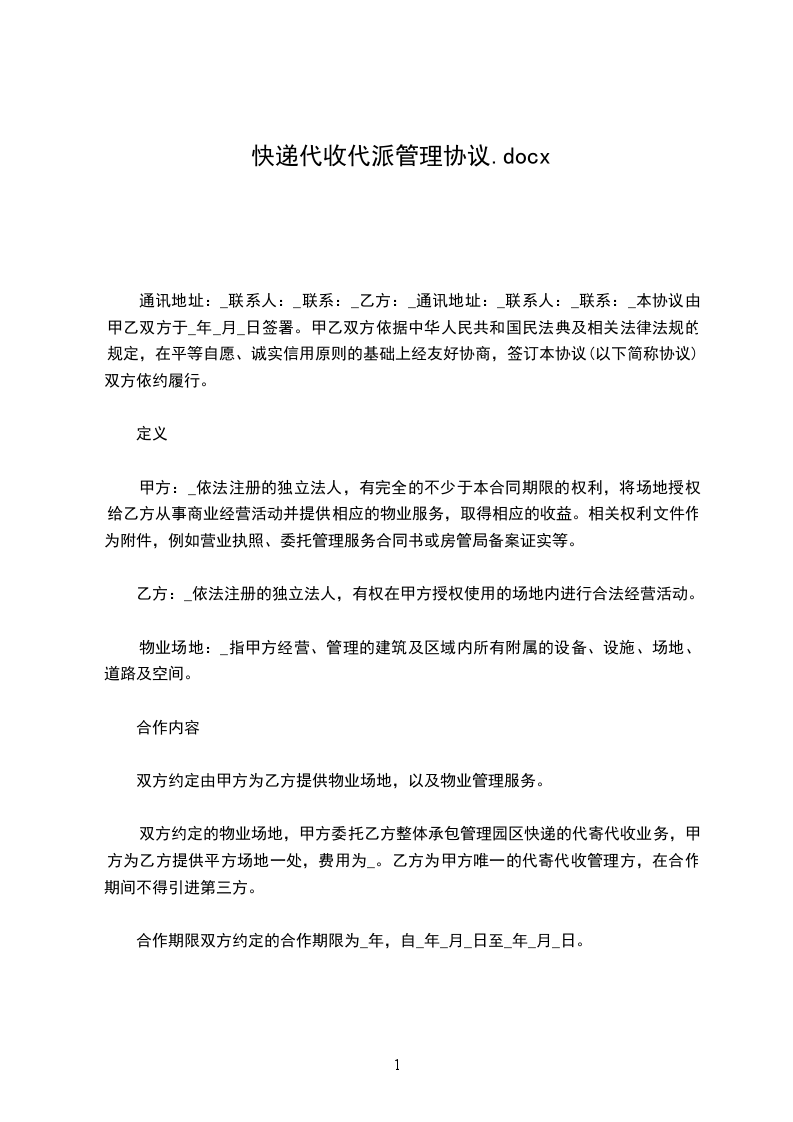 1. 乙方接受甲方委托,负责在指定区域内为甲方代派快递包裹。具体代派区域为:______________________。