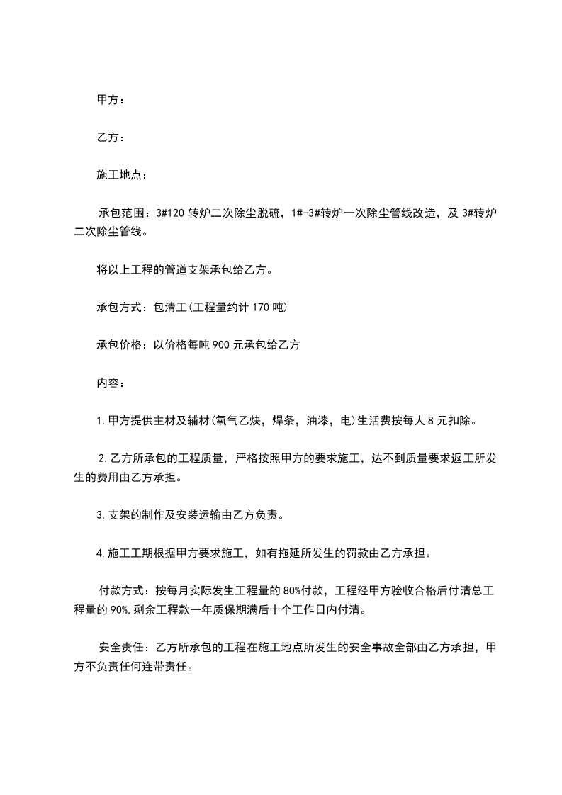 1.甲方提供主材及辅材(氧气乙炔,焊条,油漆,电)生活费按每人8元扣除。
