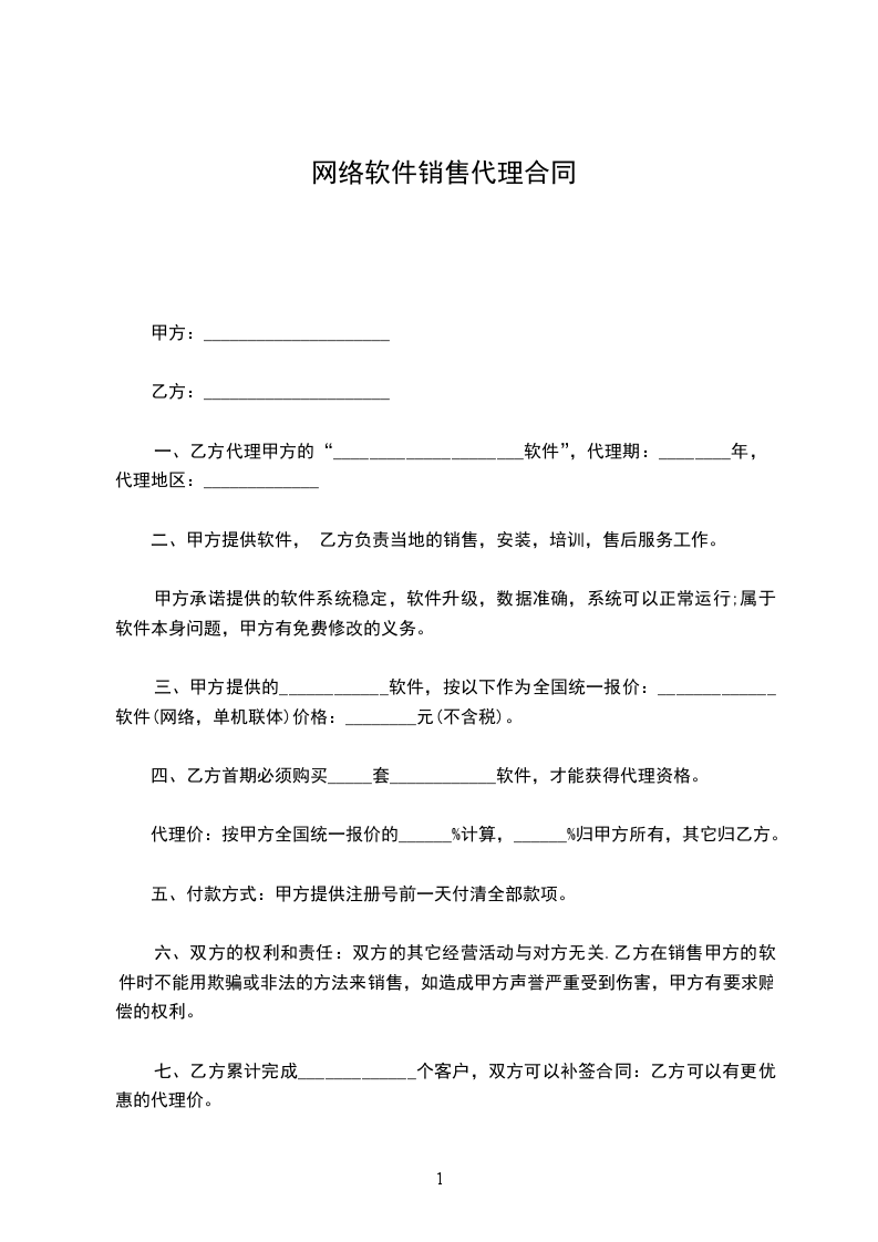 一、乙方代理甲方的“_____________________软件”,代理期:________年, 代理地区:_____________